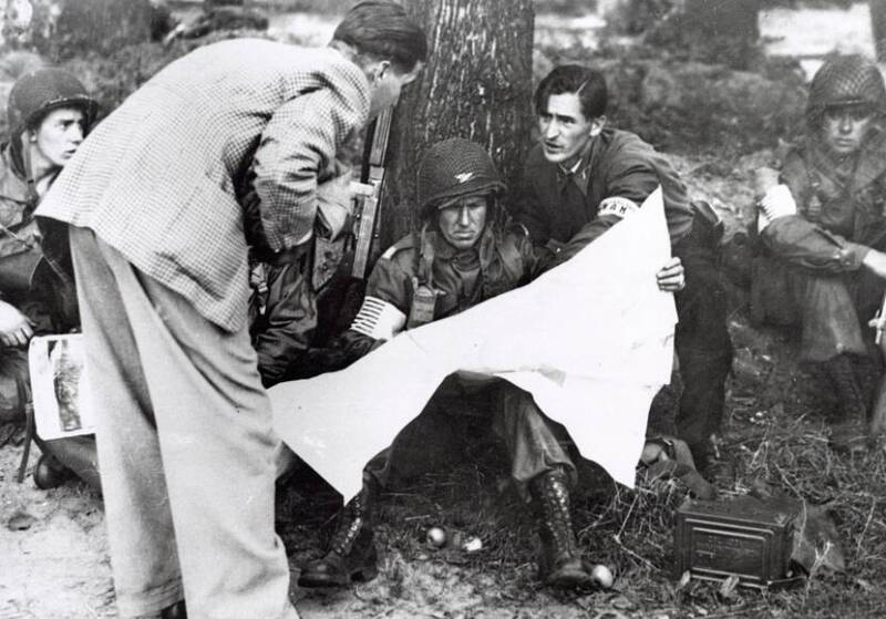 Nederlandse verzetsstrijders geven in de omgeving van Veghel informatie aan